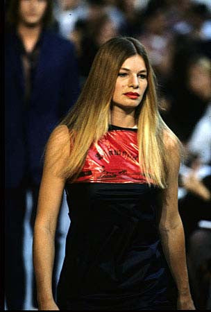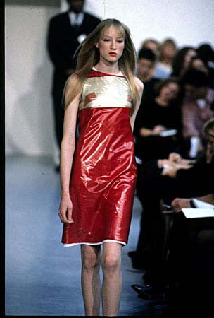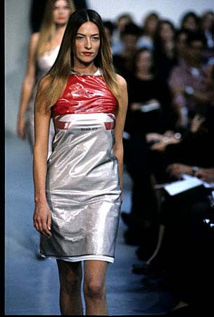 '"What I find modern is the balanced use of both traditional fabrics and new textiles," says Helmut Lang, whose balancing act for spring involves mixing cotton, wool and leather with high-tech nylon, lacquered organza and synthetics designed to reflect light. Equally important: the simple shapes that take on a sophisticated glamour, thanks to Lang's futuristic fabrics. There are cigarette thin pants, jackets cut as close as shirts, skinny skirts, fitted T-shirts, and tank dresses. "It's the idea of combining well-known quality with new surfaces that makes them exciting," says the designer.' (our emphasis)