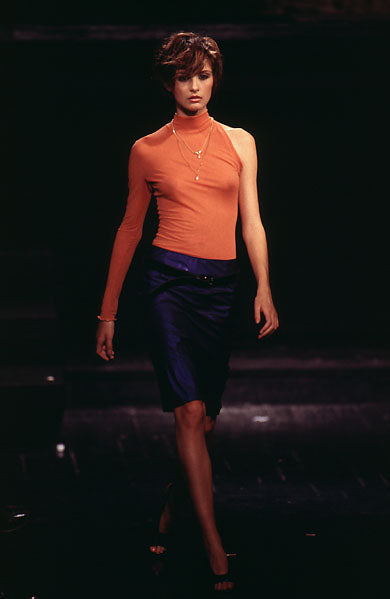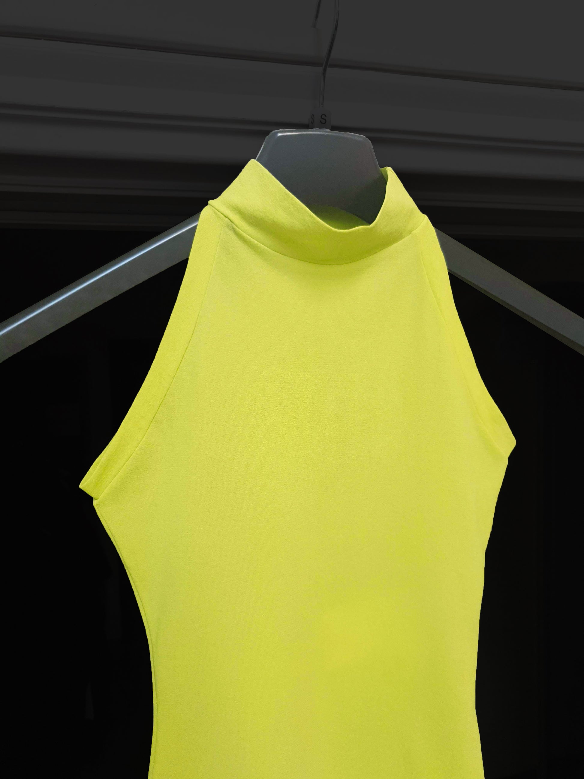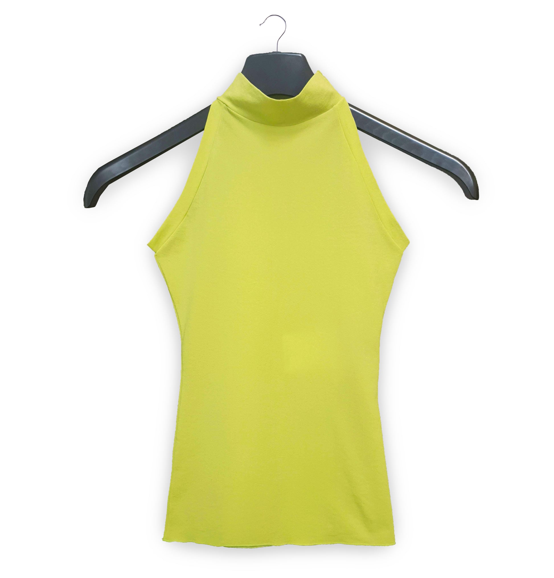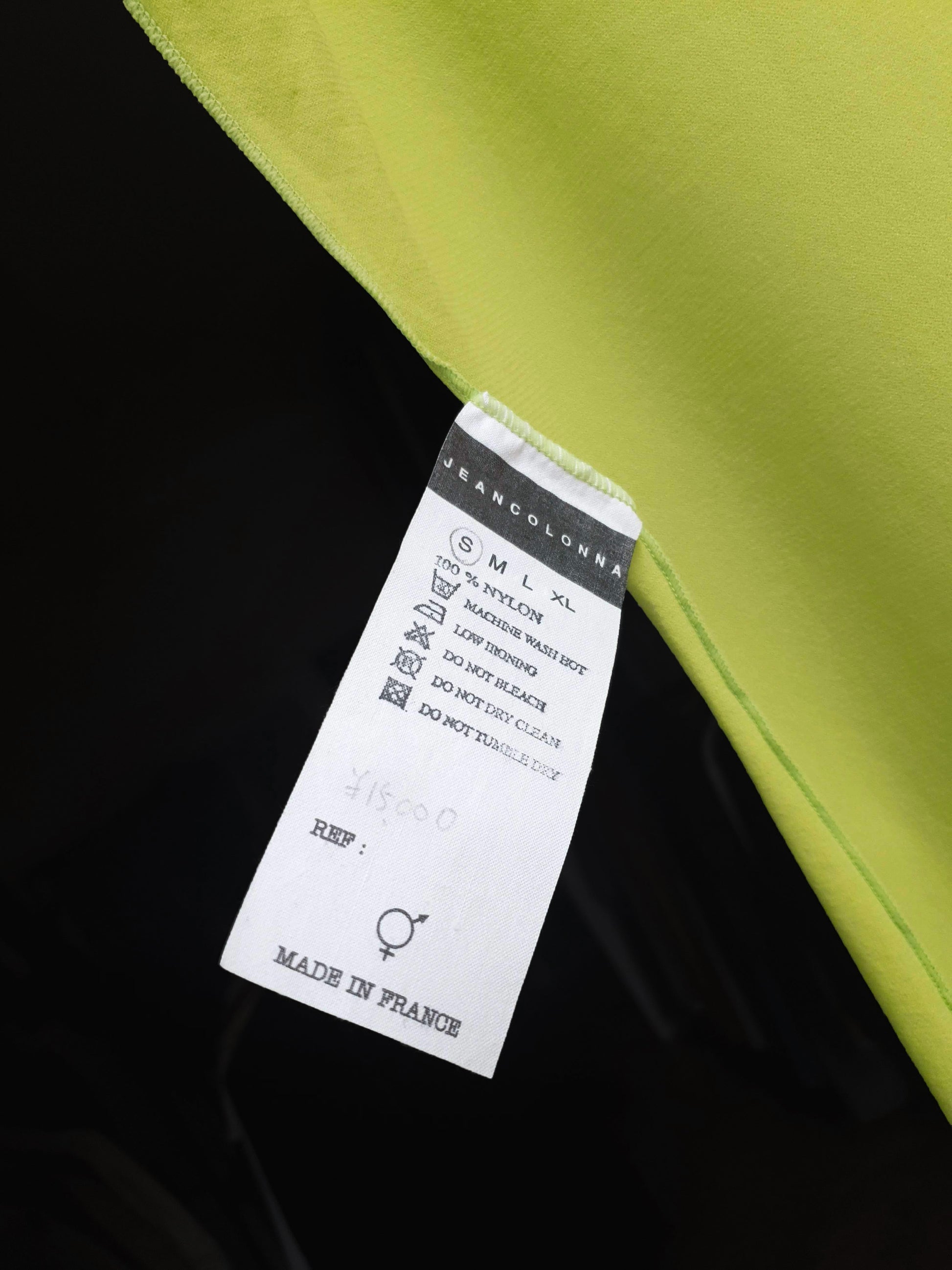 A simple but fantastically proportioned garment, this top has a cutaway silhouette with exposed shoulders and a medium funnel neck. The shape is linear, precise and complemented by the top's unusual fabric. Knit from 100% nylon with a slightly textured crêpe surface, it has a deep lime green/acid yellow colour but becomes almost translucent when stretched. The result is bold, sensual and quintessential Colonna. The hem is finished with green overlock stitching.