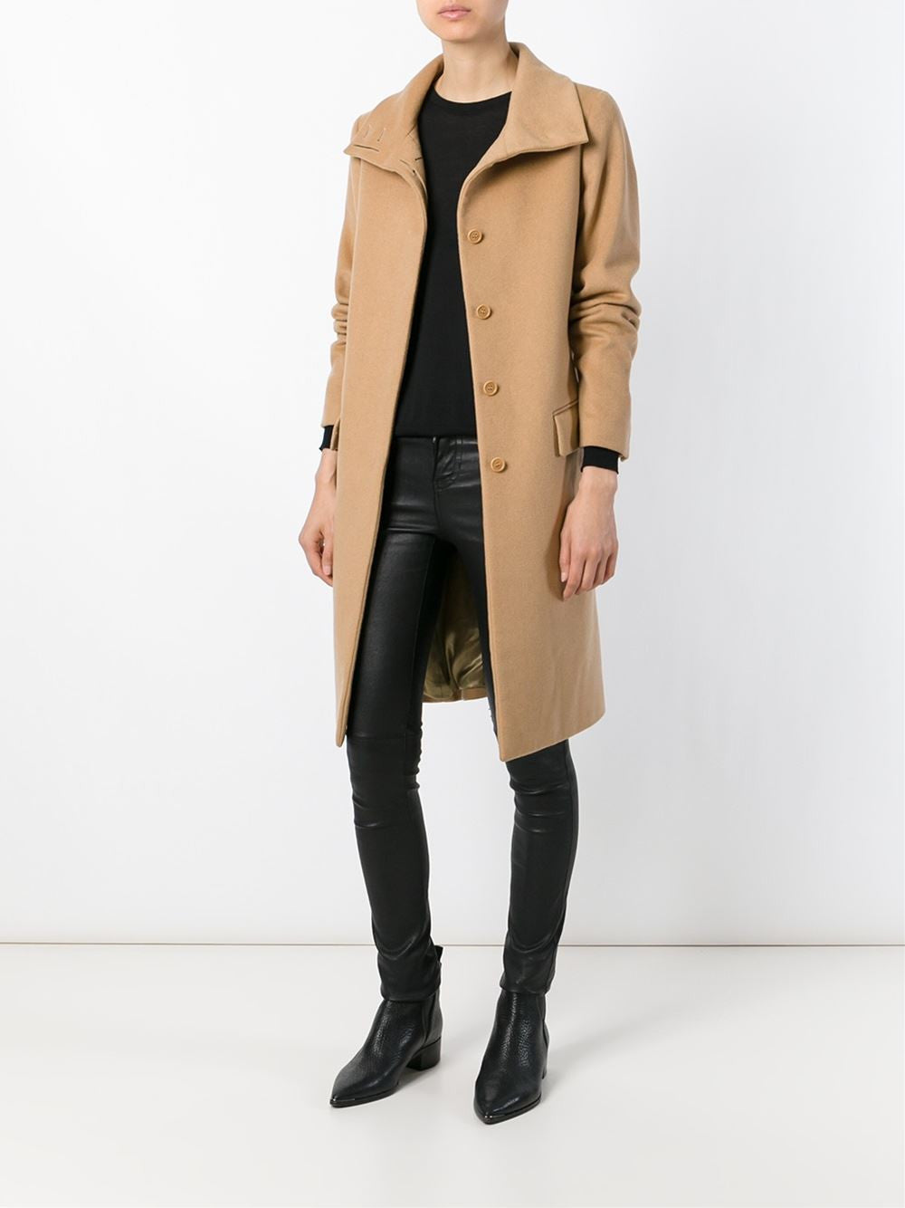 In our view, this coat captures the collection's minimalist aesthetic in its most effective. One of the runway presentation's most prominent designs, it appeared in several runway looks. The design is an adaptation of Lang's classic Chesterfield coat however, instead of classic notch lapels, a high funnel collar elegantly envelops the neck.