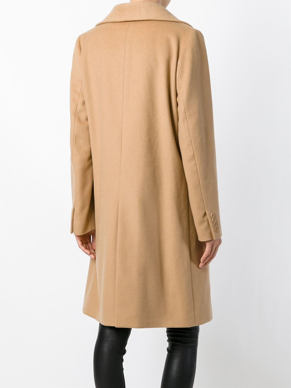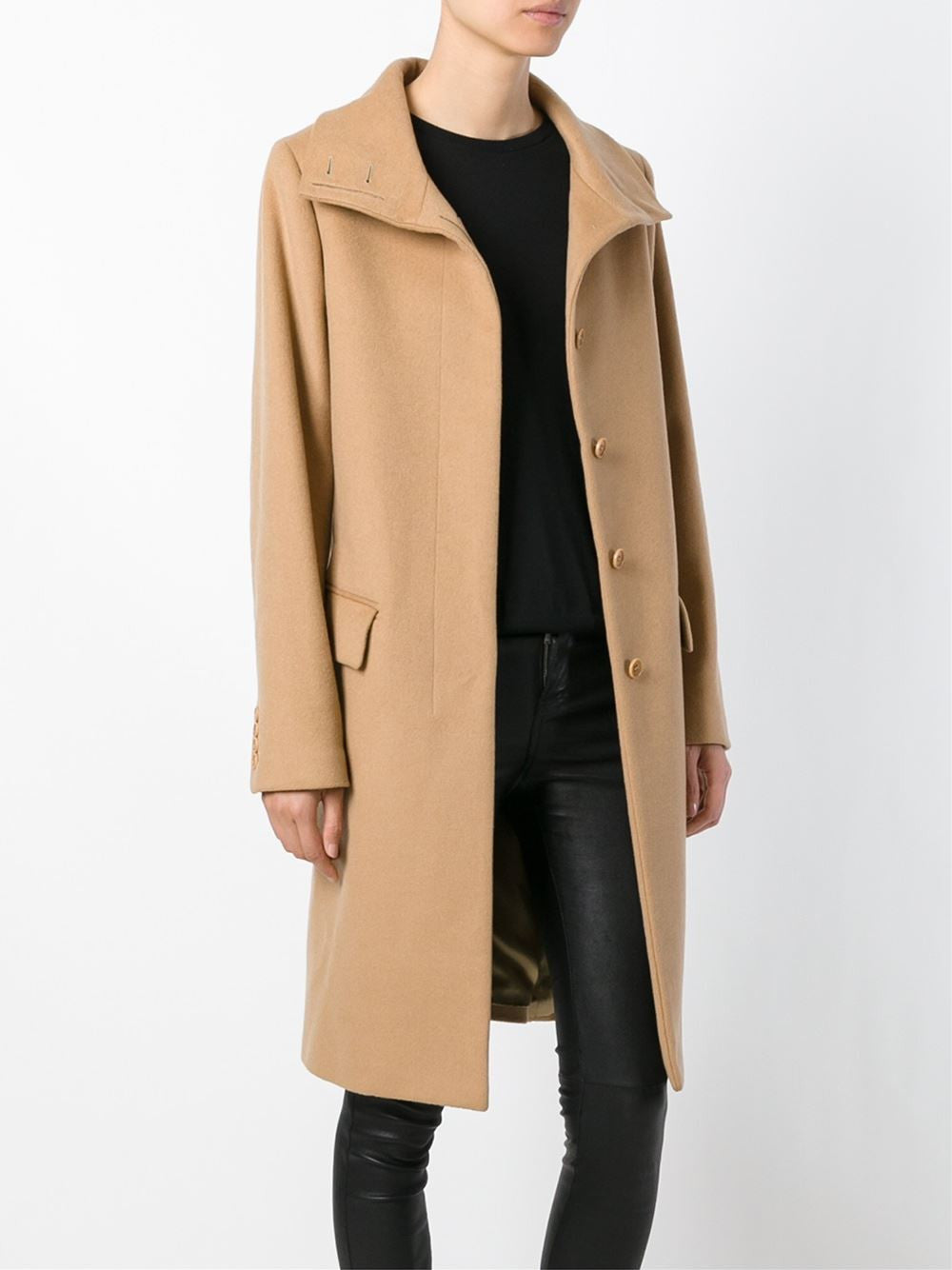 The coat's front features a concealed button closure and flap pockets on the waist. Subtle diagonal darts shape the sides of the torso and add simple detail to the refined design. The back is finished with a single vent and the sleeves have four buttons. The piece is crafted from a 100% virgin wool cloth with a fleecy texture and an easy yet substantial drape. The fabric's weight complements the coat's fitted cut, with flattering narrow shoulders, high armholes and a straight body.