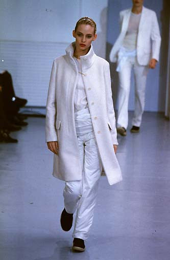 'Helmut Lang's instincts have defined the 1990's, so all the designers who have been copying him for so long should take a close look at the way he staged his show this season. Instead of a flashy presentation, there was a modest workroom created in an uncrowded gallery. [...] The show opened with funnel-neck jackets in creamy colors, layered over shirts or trousers of butter, white, taupe and tan. [...] Mr. Lang presented a quiet storm, taking ideas from past seasons and infusing them with elegance and sophistication: the banded coat, the sash, the cummerbund, the froth of tulle starkly cut, elastic bands gripping dresses like escaped pieces of lingerie. [...] [Ann Demeulemeester and] Mr. Lang will someday jointly be considered the archetypes of this decade.'
