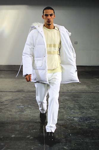 For A/W 1997 -the first winter collection of his year-old Helmut Lang Jeans label-, Lang took the denim-based explorations of S/S 1997 to new heights of sophistication. While the runway show focused on the clean lines of Lang's tailoring, it is the streetwear that is now considered as some of his most covetable output: This collection introduces the iconic bulletproof vest, Lang's renown take on the M-51 military parka and several groundbreaking fabric treatments for denim. Amy Spindler writes: