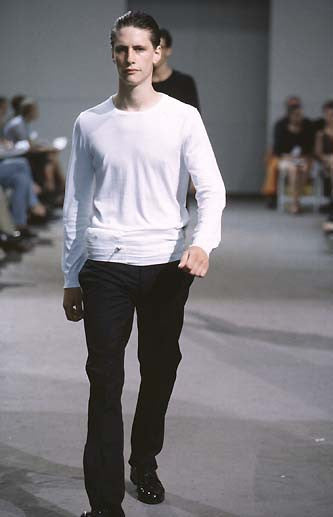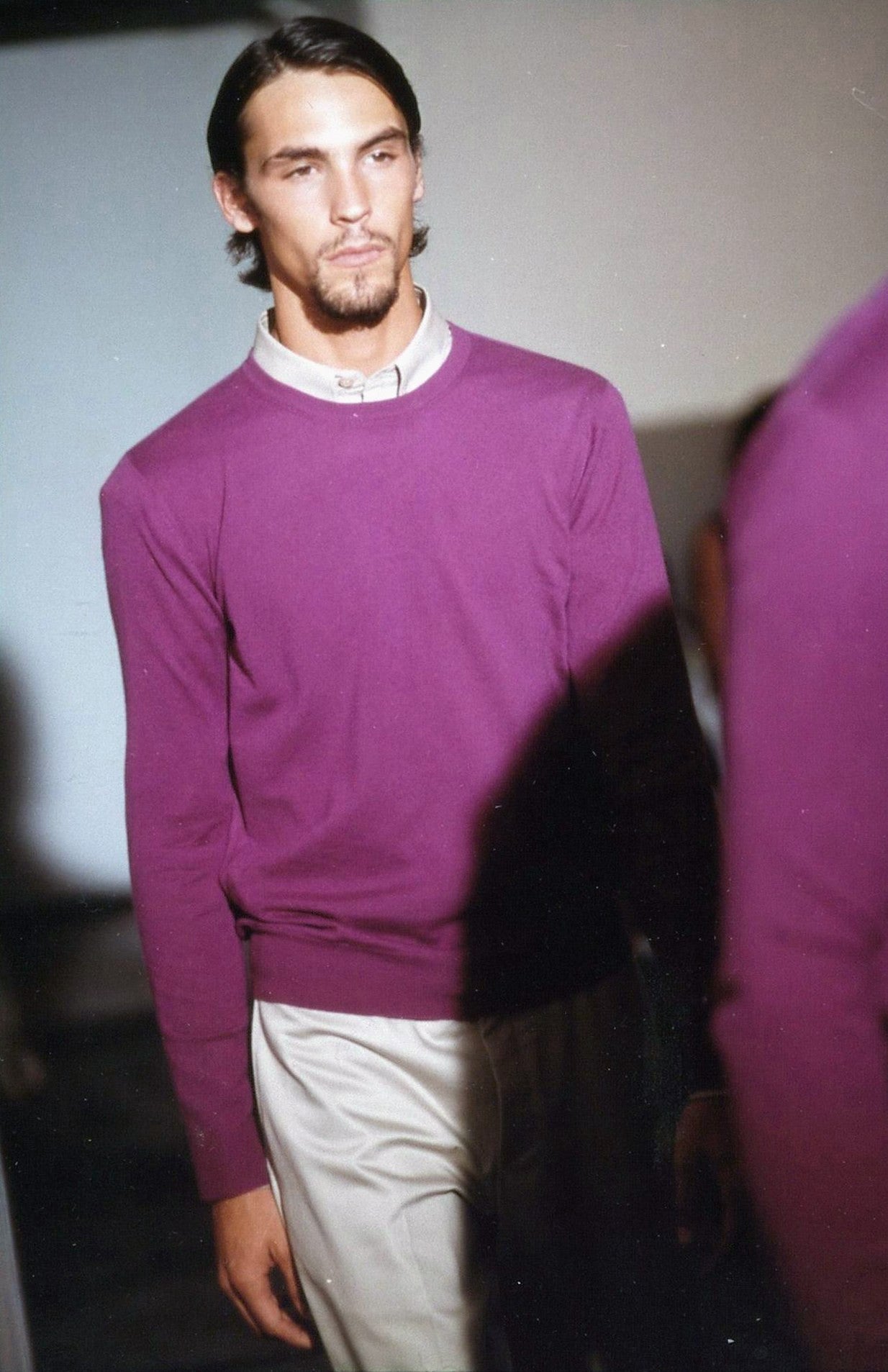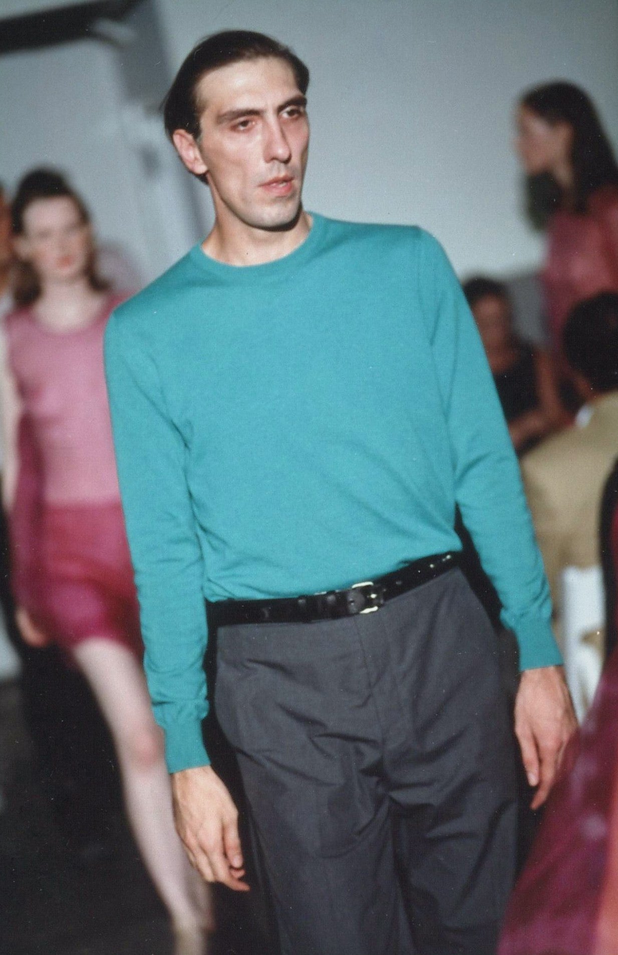 Helmut Lang's minimalist output was often about creating a well-curated wardrobe rather than making short-term fashionable statements. As part of this aim, Helmut Lang stores always offered a range of classic designs besides seasonal creations. These ranged from his signature Chesterfield coat and suits to shirting and underwear, and this fine sweater is an example of such a staple (pictured: S/S 98, S/S 00 and A/W 96).