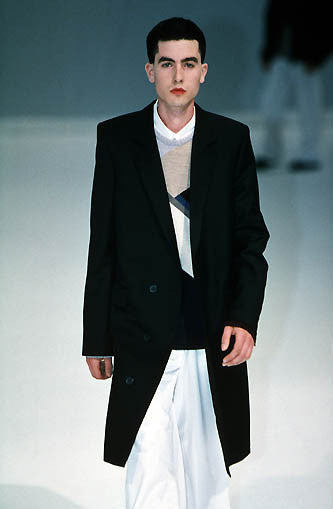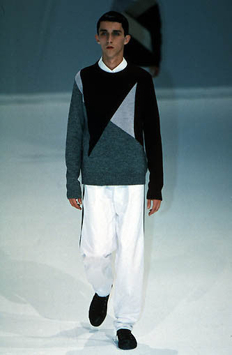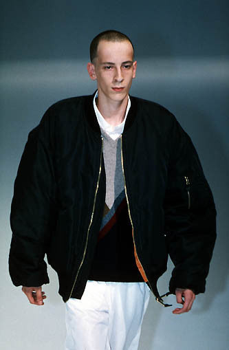 For S/S 2000, Raf Simons sought inspiration in two contrasting depictions of youth. On the one hand were the members of MENSA, an international high IQ society: Their influence was seen in sweater-and-shirt looks, inoffensive colours and 'nerdy' athletic blousons. On the other hand there was Gabba, a subgenre of hardcore techno popular in Belgium, Germany and the Netherlands. Simons paid a nonchalant tribute to ravers through the collection's distinctive oversized military outerwear, sleeveless tops and baggy trousers. The result was a hybrid look that combined subculture-inspired streetwear with the aesthetic austerity often found in academia.