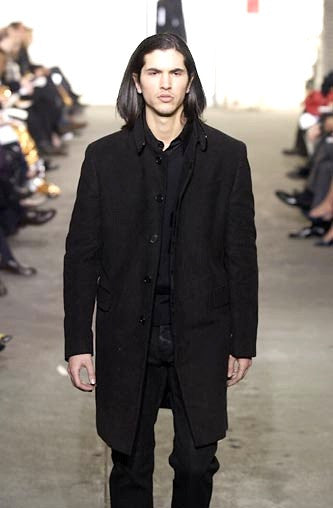 The A/W 2002 collection epitomises the high sophistication of Lang's final years, and we consider it as one of his very best seasons. The sobriety of evening wear and classic tailored shapes was subverted by the use of deconstructed cut-outs and intricately layered jersey skeletons, while lustrous patent leather and exotic skins such as perch and stingray lent an avant-garde edge to the luxurious designs. At the same time, hallmark Helmut Lang materials such as heavy moleskin cotton, raw denim and rubber elastic tape highlighted the collection's self-referential character, which drew elements from Lang's military streetwear collections from the 1990s. The overall result was an eclectic celebration that brought together disparate influences to create a sophisticated and thoroughly modern wardrobe. A novel take on Lang's classic Chesterfield coat, this handsome piece captures the designer's severe and streamlined approach to classic menswear. Upon a closer inspection, luxurious leather trims and bondage-inspired details on the interior add a distinctive elegance.
